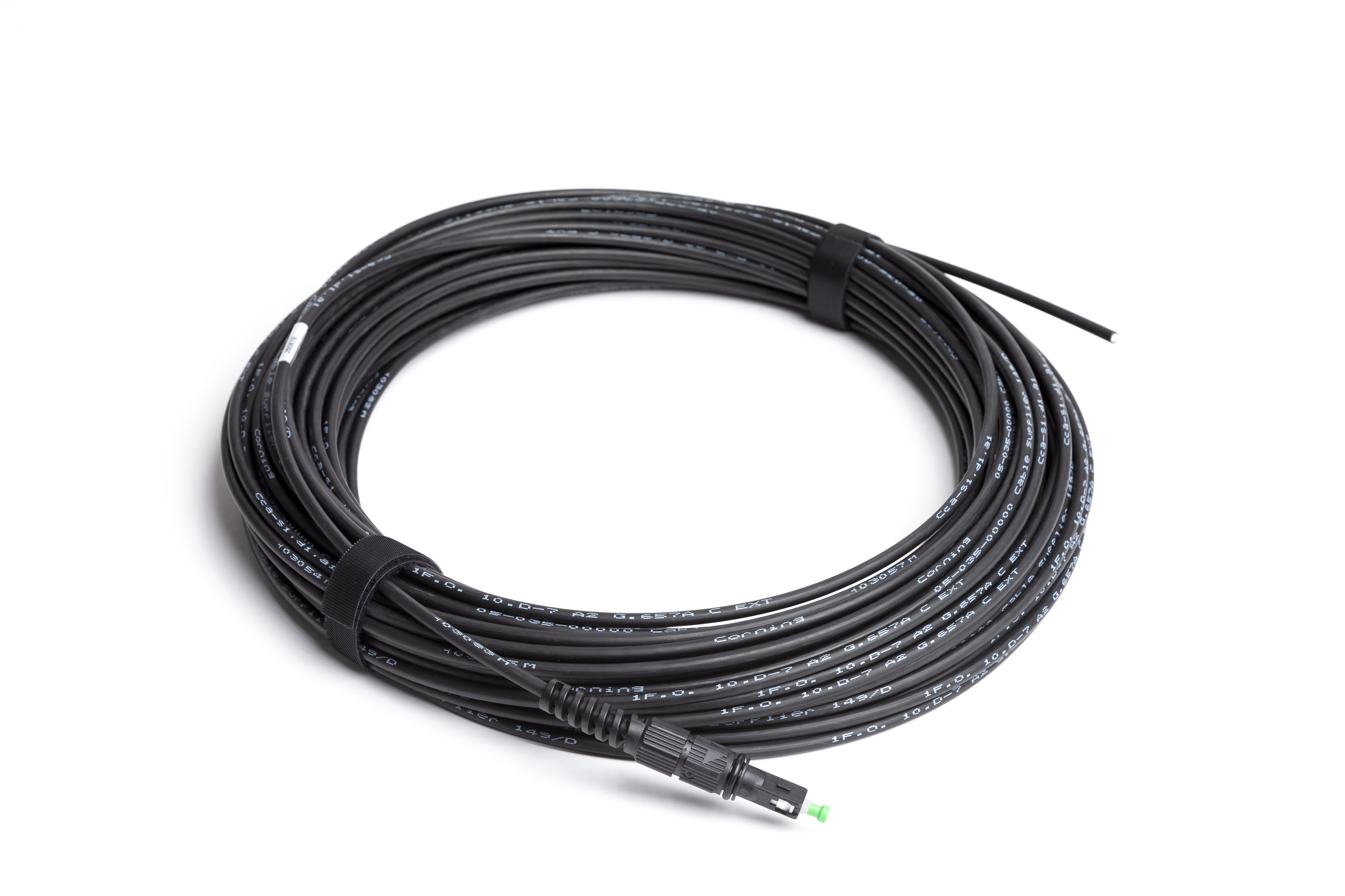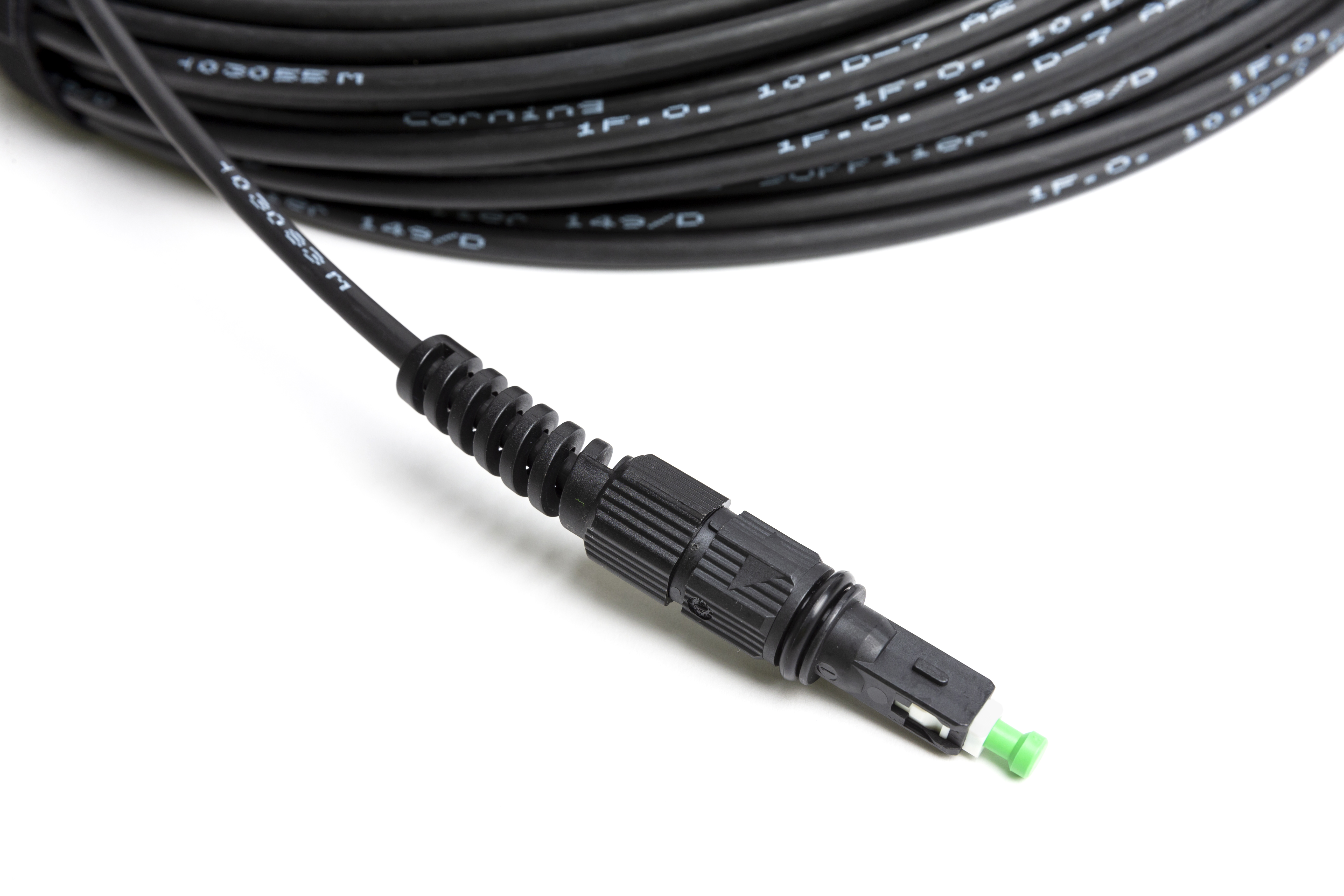 Cable óptico de acometida con conector reforzado tipo Ecam Connect para instalaciones en exterior en condiciones de intemperie por tendido aéreo, canalización o fachada en tramos finales en interior de edificios. Utiliza fibra G657.A2 con bajo radio de curvatura. Este cable se utiliza en la red de dispersión FTTH para la instalación de altas individuales de cliente en tramos y tendidos de exterior desde cajas terminales ópticas con adaptadores reforzados tipo Ecam Connect. Estructura: Tubo holgado relleno de gel. Diámetro del cable: 5mm