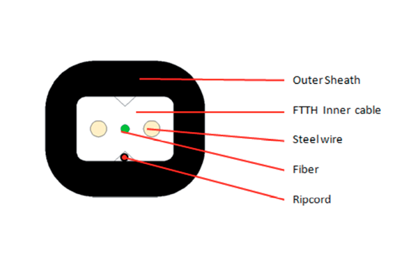 Cable óptico constituido por una fibra óptica G657A2 , cubierta exterior e interior plana. Cubierta interior LSZH blanca. Cubierta exterior: PE negra. Sección interior: (1,95 x 2,95) ± 0,1. Sección exterior: (4,2 x 4,9) ±0,2 mm Con elementos de refuerzo cubierta interior: plástico reforzado con fibra (FRP) a cada lado.