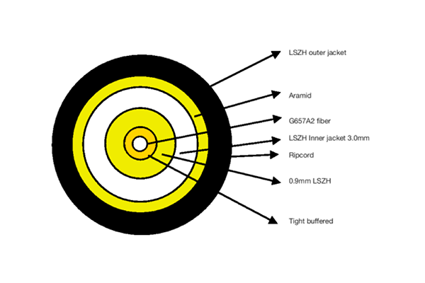 Bobina exterior cable color negro de 4,6 mm, con armadura metálica. Subcable interior de 3 mm color blanco. Uso en interior y exterior. Utiliza fibra G657.A2 con bajo radio de curvatura. Elementos de refuerzo: armadura metálica. Estructura: ajustada.