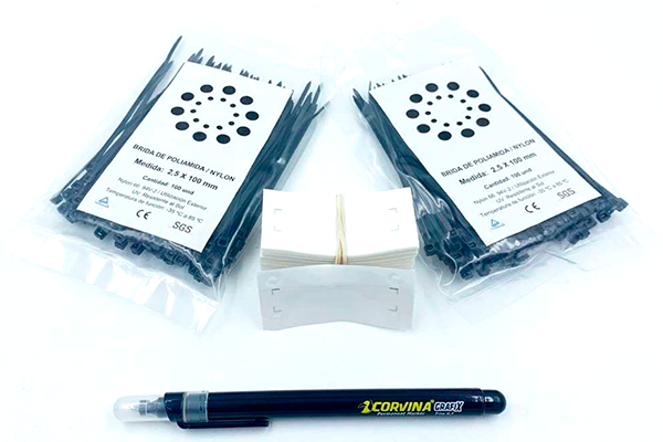 Etiquetas para identificación y señalización en cables de planta externa, genericas, sin logo, incluye 100 ud de etiquetas 80 x 50 mm, 200 ud bridas y rotulador indeleble.