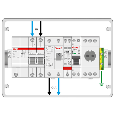 004-0000 - Esta caja de Gave viene preparada para proteger un punto de recarga de VE monofasico. Tiene incluido un magnetotermico 1P+N de 40A, diferencial rearmable de 40A/30mA tipo A Hi, una toma schuko de 16 A y protección sobretension permanente y transitoria de tipo II.