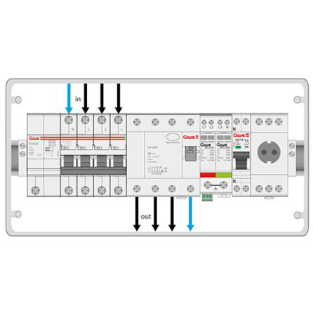 004-0001 - Esta caja de Gave viene preparada para proteger un punto de recarga de VE trifasico. Tiene incluido un magnetotermico 3P+N de 40A, diferencial rearmable de 40A/30mA tipo A Hi, una toma schuko de 16 A y protección sobretension permanente y transitoria de tipo II.
