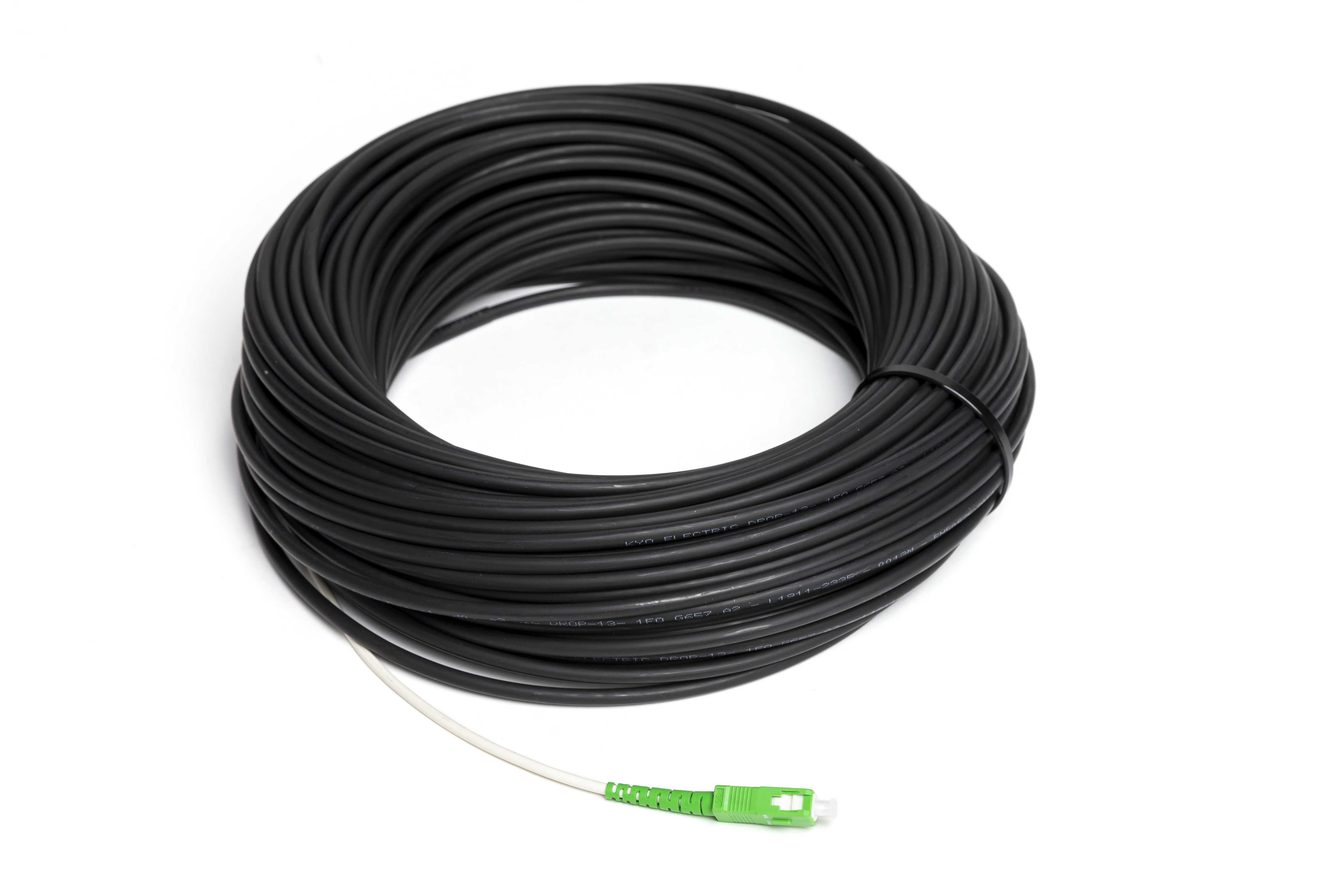 Acometida exterior preconectorizada con conector SC/APC en un extremo, realizada con cable color negro de 3,5 mm, con subcable interior de 3 mm color blanco. Uso en interior. Utiliza fibra G657.A2 con bajo radio de curvatura. Estructura ajustada.