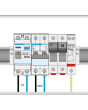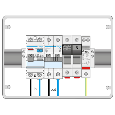 004-0015 - Caja de conexión monofásica equipada con protección automático, diferencial y sobretensiones. La caja incluye interruptor automático 1P+N de 50A curva C, protector de sobretensiones tipo II y diferencial tetrapolar tipo A de 63A/300mA protegido contra disparos intempestivos.