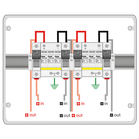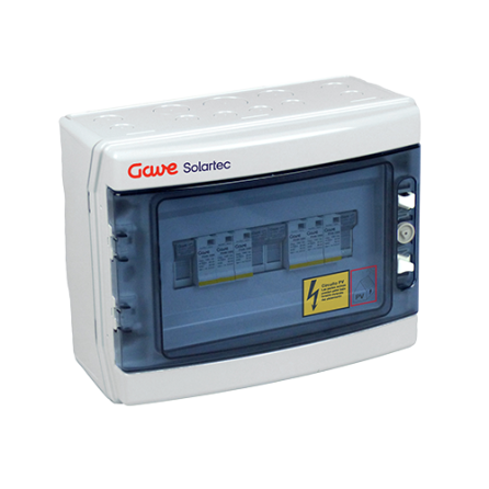 004-0018 - Caja de protecciones en DC para 2 string compuesta por portafusible y fusible de 20A y protector sobretensión tipo II, válida para una tensión máxima de 1000Vdc. Tiene un grado de protección IP65 y IK08.