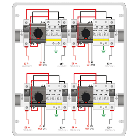 004-0023 - Caja de protecciones en DC para 4 strings compuesta por portafusible y fusible de 20A, seccionador de 25 A y protector sobretensión tipo II, válida para una tensión máxima de 1000Vdc. Tiene un grado de protección IP65 y IK08.