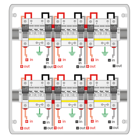 004-0035 - Caja de protecciones en DC para 6 string compuesta por portafusible y fusible de 20A y protector sobretensión tipo II, válida para una tensión máxima de 1000Vdc. Tiene un grado de protección IP65 y IK08.