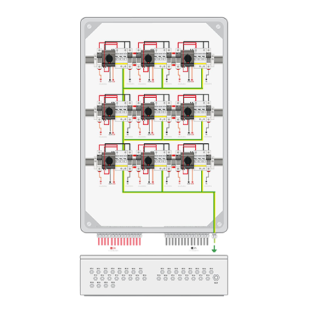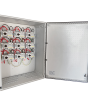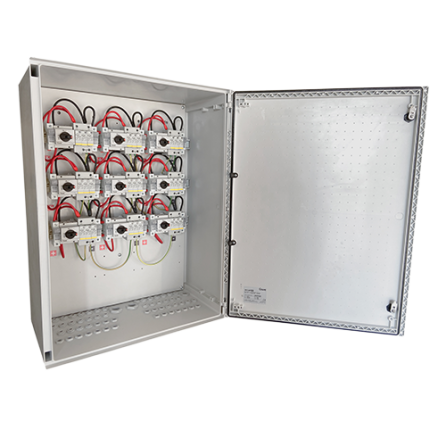 004-0038 - Armario de protección DC para 9 strings. Cuenta con portafusible, fusible 20A, seccionador de 25A y protectores sobretensión tipo II. Valida para instalaciones con tensión máxima de 1000Vdc.El envolvente es de poliéster reforzado en fibra de vidrio autoextinguible color gris RAL 7035 con puerta de 180º de apertura de cierre de doble barra. Tiene un grado de protección IP66 y resistencia a los impactos IK10.