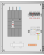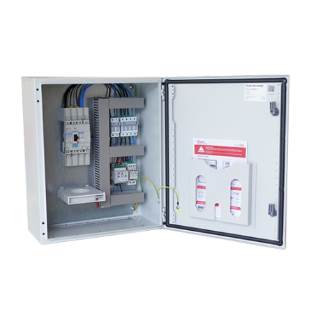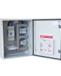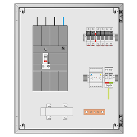 004-0051 - Armario de conexión 400V AC 3P+N para salida de un inversor trifásico hasta 160A con protección automática, diferencial y sobretensiones. Interruptor automático 3P+N 160A con relé TM regulable. Protección diferencial mediante relé con sensibilidad y temporización regulable. Transformador diferencial circular diámetro 80mm. Protector de sobretensiones tipo II con protección fusible asociada. El envoltorio en acero laminado tiene la fijación mural, con un grado de protección IP66 y resistencia a l