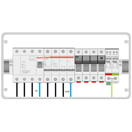 004-0080 - Caja de conexión trifasica equipada con protección automático, diferencial y sobretensiones. La caja incluye interruptor automático 3P+N de 16A curva C, protector de sobretensiones tipo II y diferencial tetrapolar tipo A de 40A/300mA protegido contra disparos intempestivos.
