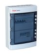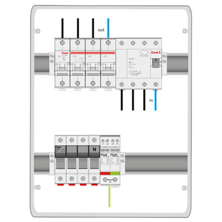 004-0084 - Caja de conexión trifasica equipada con protección automático, diferencial y sobretensiones. La caja incluye interruptor automático 3P+N de 100A curva C, protector de sobretensiones tipo II y diferencial tetrapolar tipo A Hi de 125A/30mA protegido contra disparos intempestivos. Viene con espacio disponible para colocar un medidor FV.