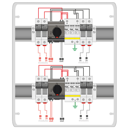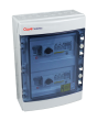 004-0115 - Caja conexión PV modular para 2MPPT, 2 strings independientes x mppt (4 entradas, 4 salidas) base y fusible 15A gPV + seccionadores 2 circuitos 25 A con protectores sobretensión clase II tensión máxima de 1000Vdc, para realizar instalaciones con toda seguridad. Caja en policarbonato de doble aislamiento clase II apto para uso exterior con una elevada resistencia a los golpes (IK08). Dimensiones de 436x310x148mm.
